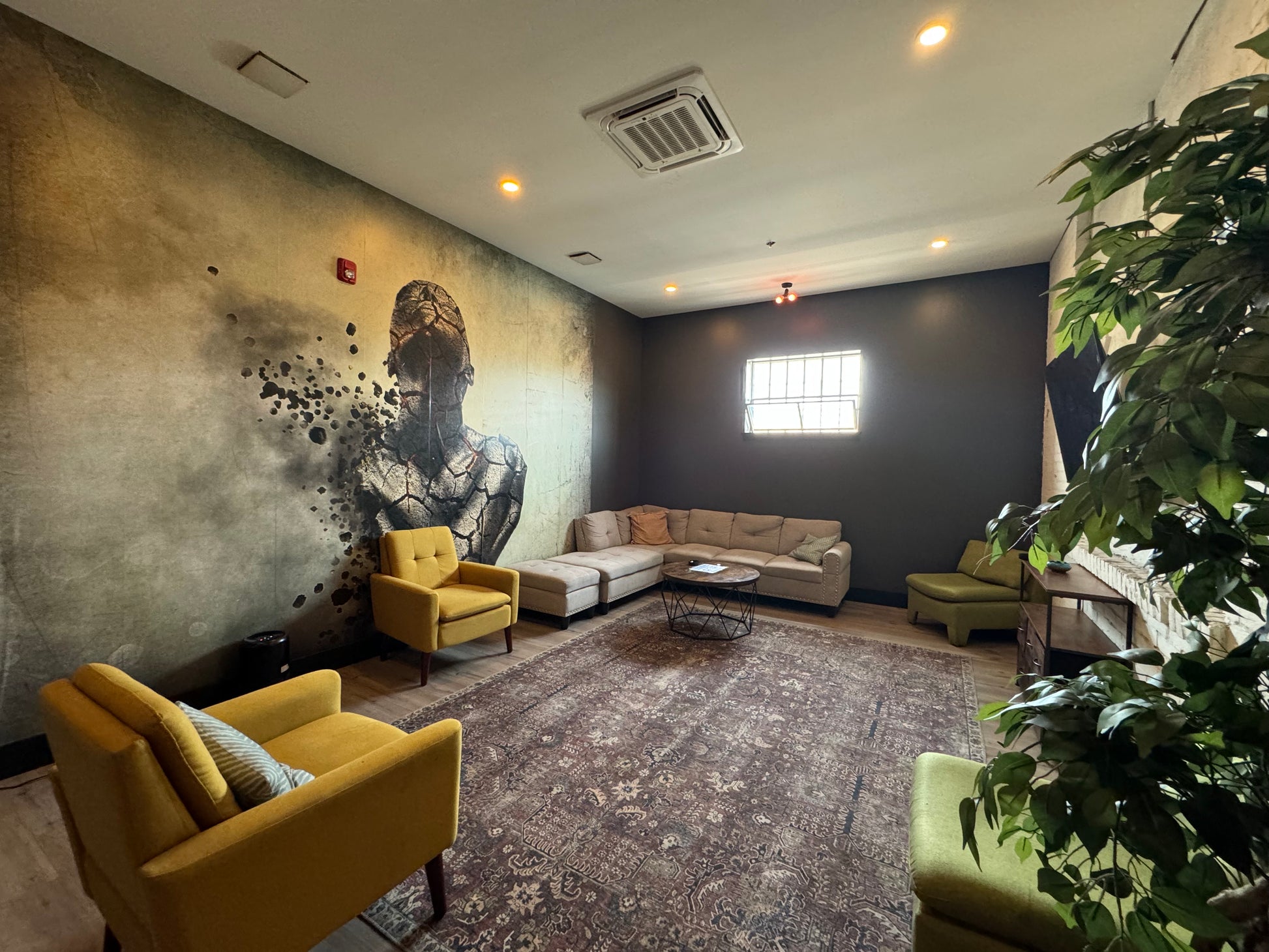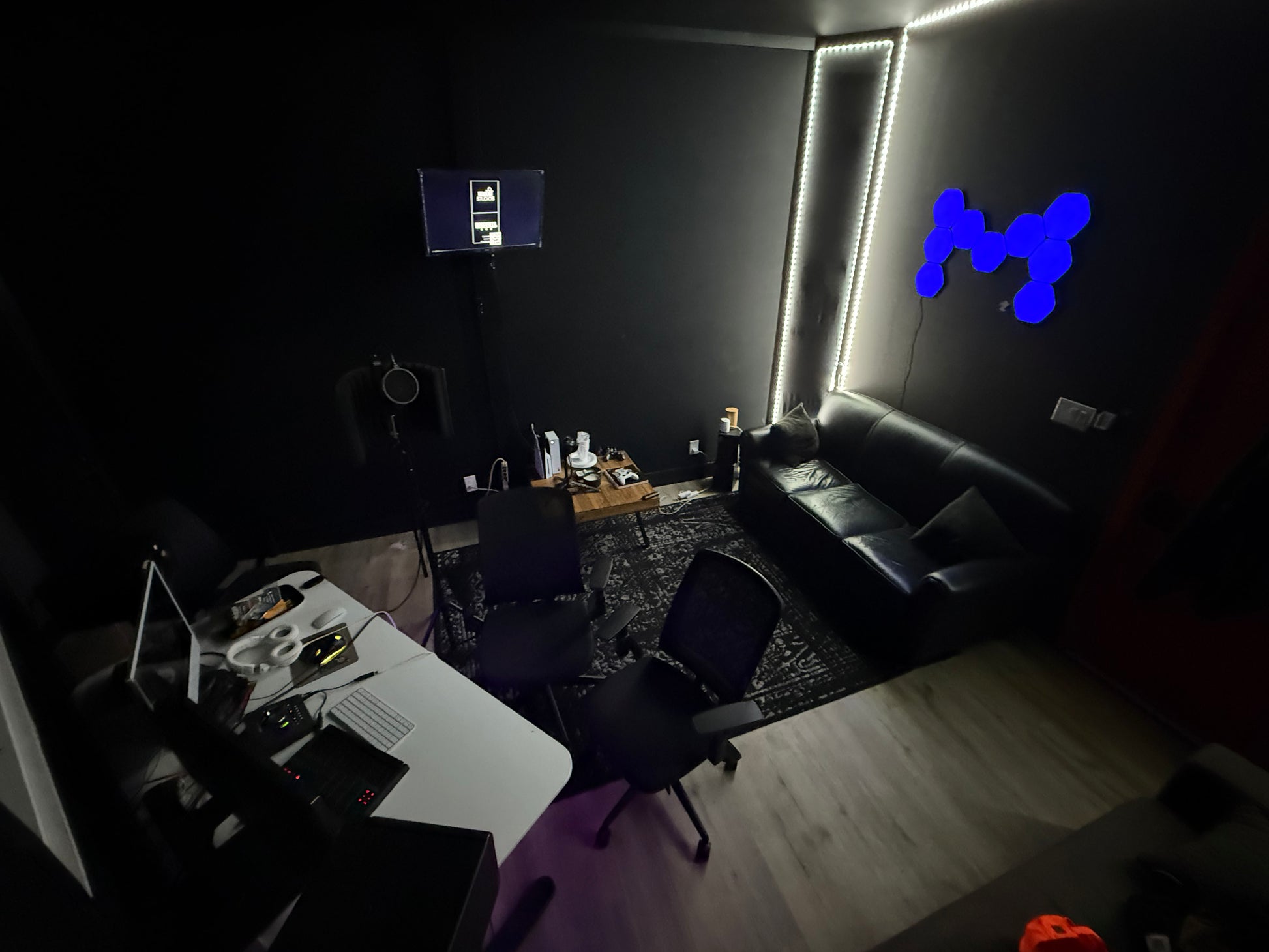 The space includes a fully equipped vocal booth featuring a Neumann TLM 102 microphone and a Apollo Twin interface — ideal for capturing clean, professional recordings. The seating area offers a solid wooden coffee table, two comfortable couches for collaborators or guests, and an environment built for both focus and creative energy.